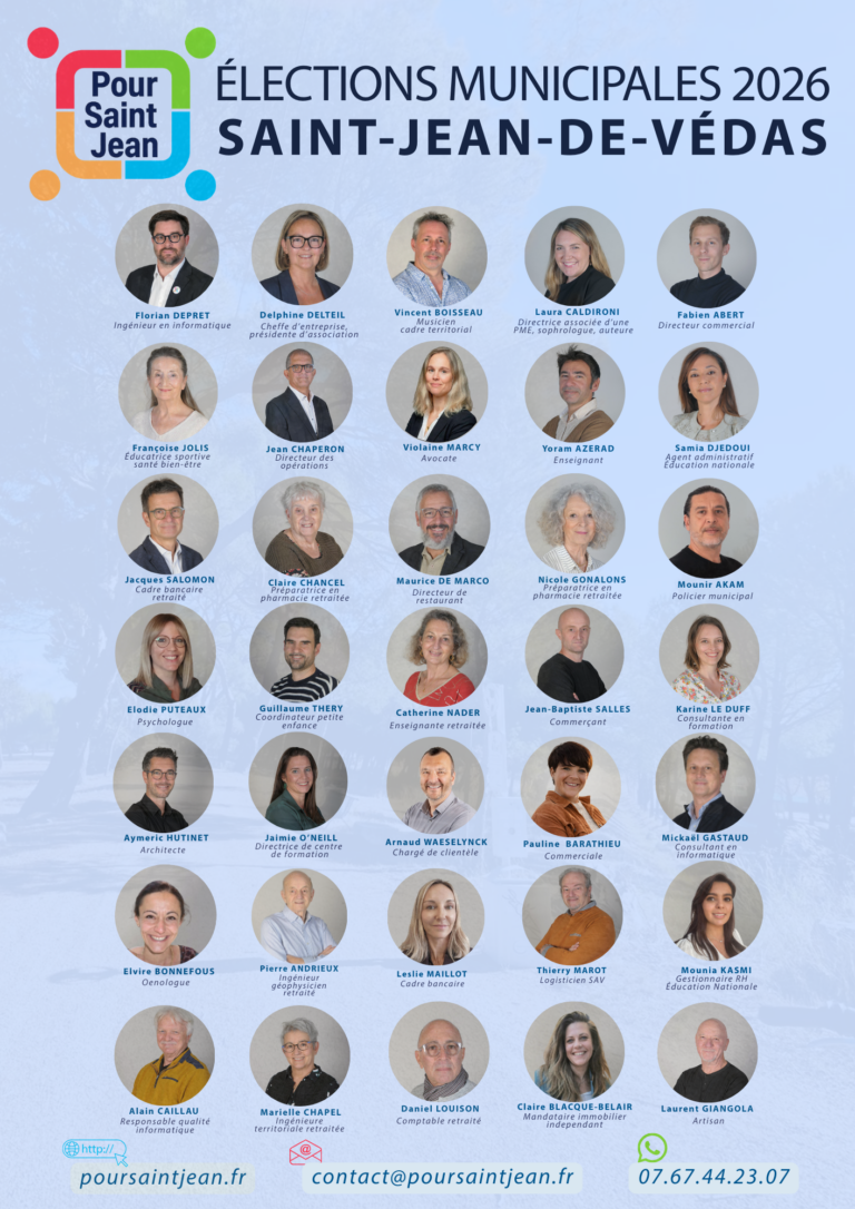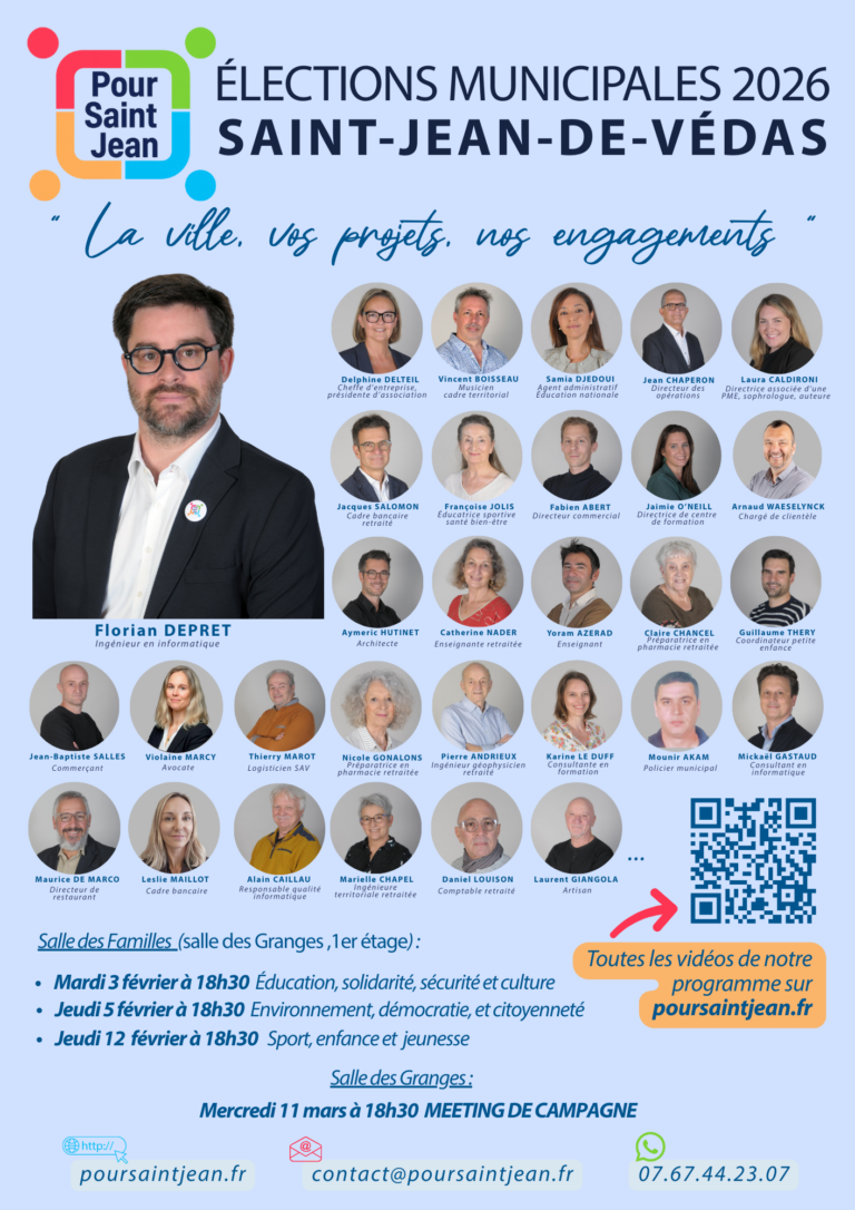 Saint-Jean-de-Védas mérite une gouvernance apaisée, exigeante et tournée vers l’avenir. C’est le sens du projet que nous portons pour ces élections : une alternative transpartisane, républicaine, écologiste et humaniste, fondée sur l’intérêt général, la responsabilité et le respect de toutes et tous. Construit au fil de deux années de rencontres de terrain, d’échanges et d’écoute, ce projet s’inscrit dans une vision à long terme pour préparer dès aujourd’hui le Saint-Jean-de-Védas de 2040 : une commune résiliente face au changement climatique, solidaire, démocratique et agréable à vivre.