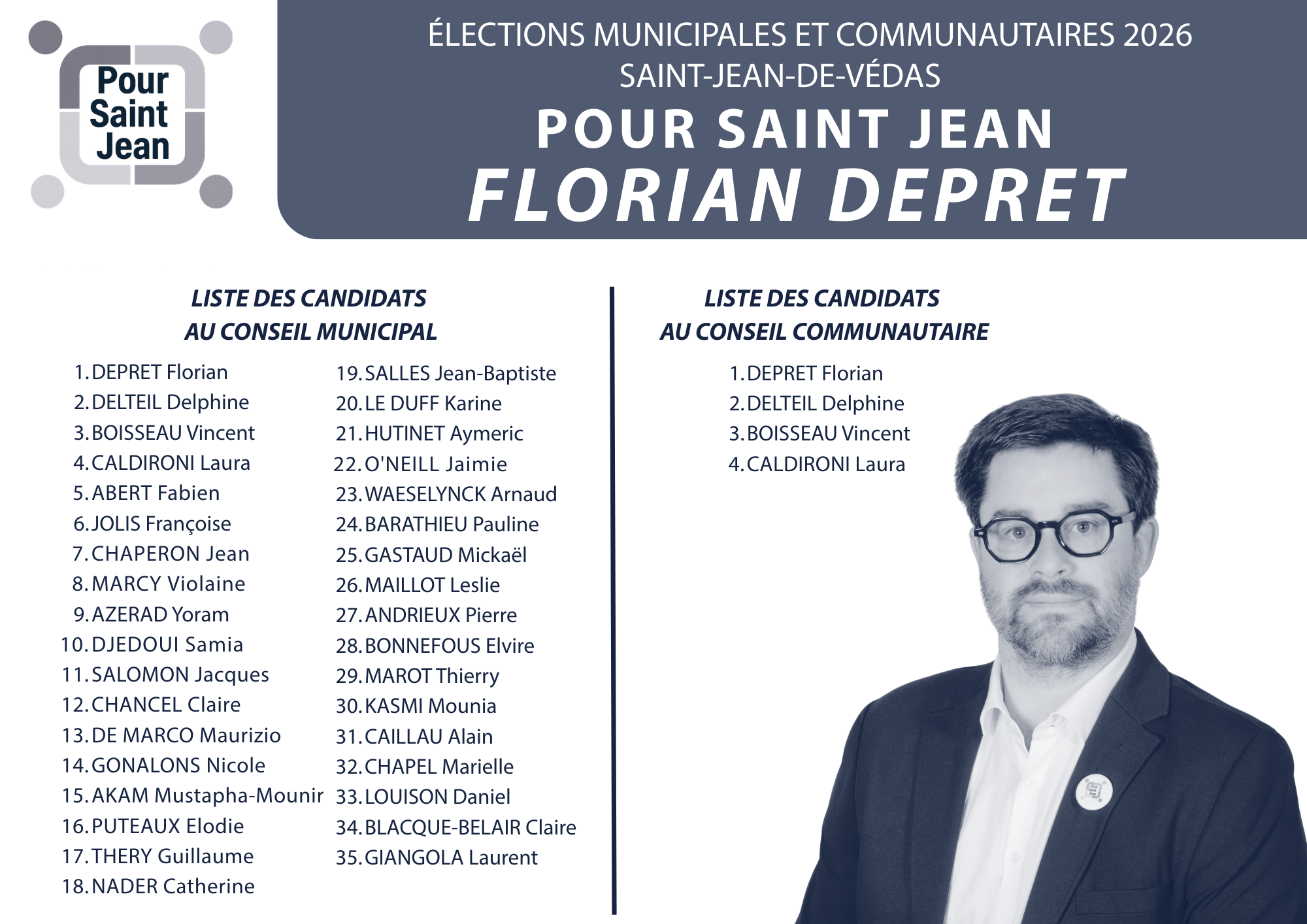 Engagé depuis toujours dans la vie associative, j’ai souhaité m’impliquer davantage encore dans la vie de notre cité. J’ai pour cela fédéré autour de moi un groupe de Védasiennes et de Védasiens animés par la même envie : réfléchir ensemble à l’avenir de notre commune, à un moment charnière de son histoire, celui où, de village devenu petite ville, Saint-Jean-de-Védas grandit et évolue pour devenir une ville de 15 000 habitants, au sein de la septième métropole de France.